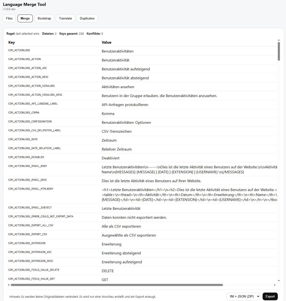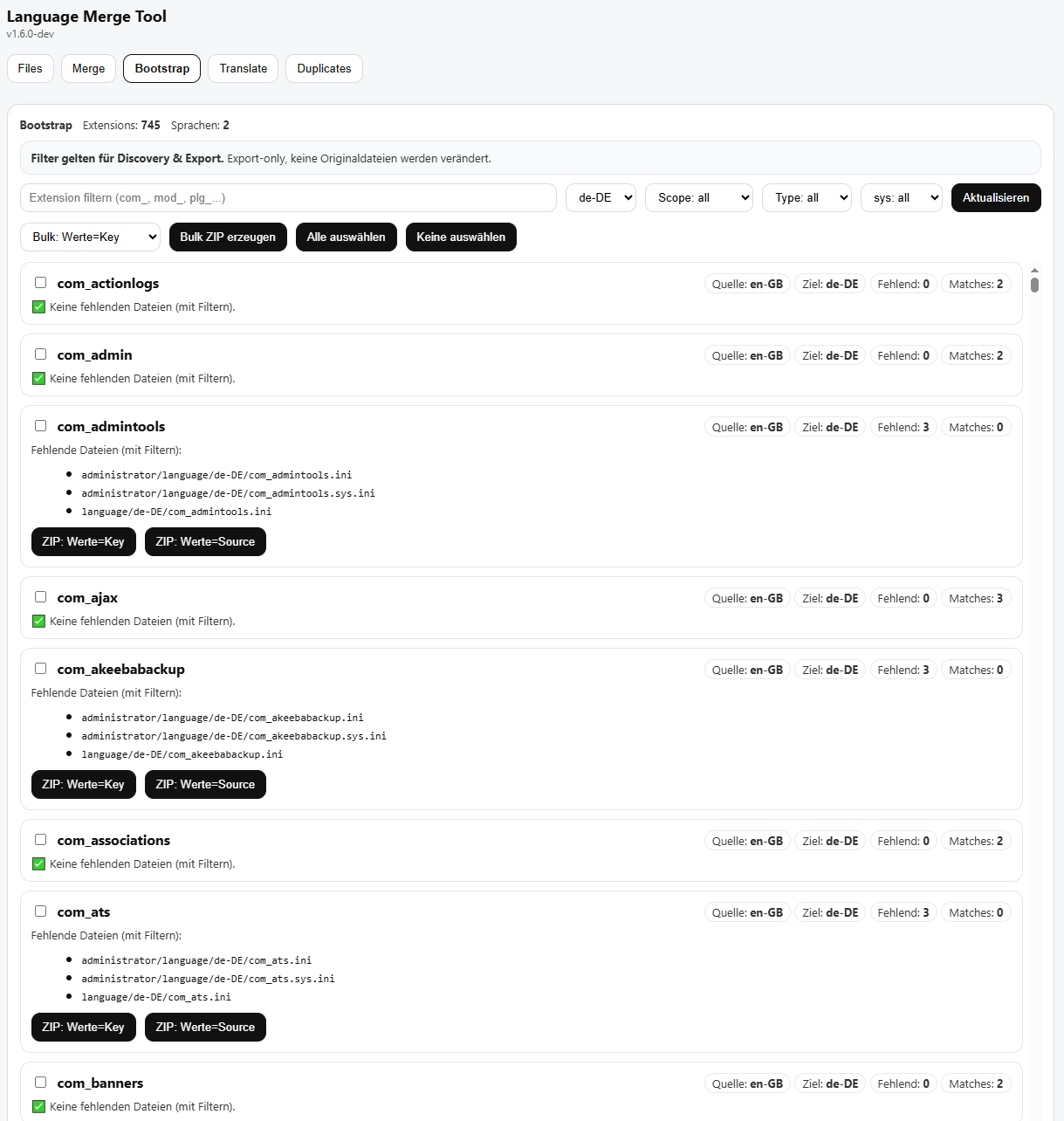 Alles, was du brauchst, um Joomla-Übersetzungen zu mergen, zu bereinigen und zu bootstrappen.